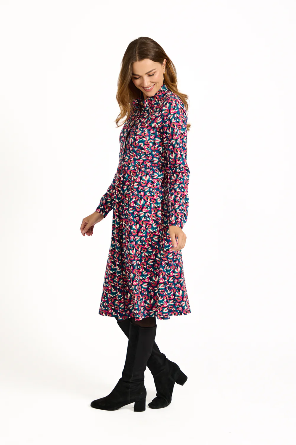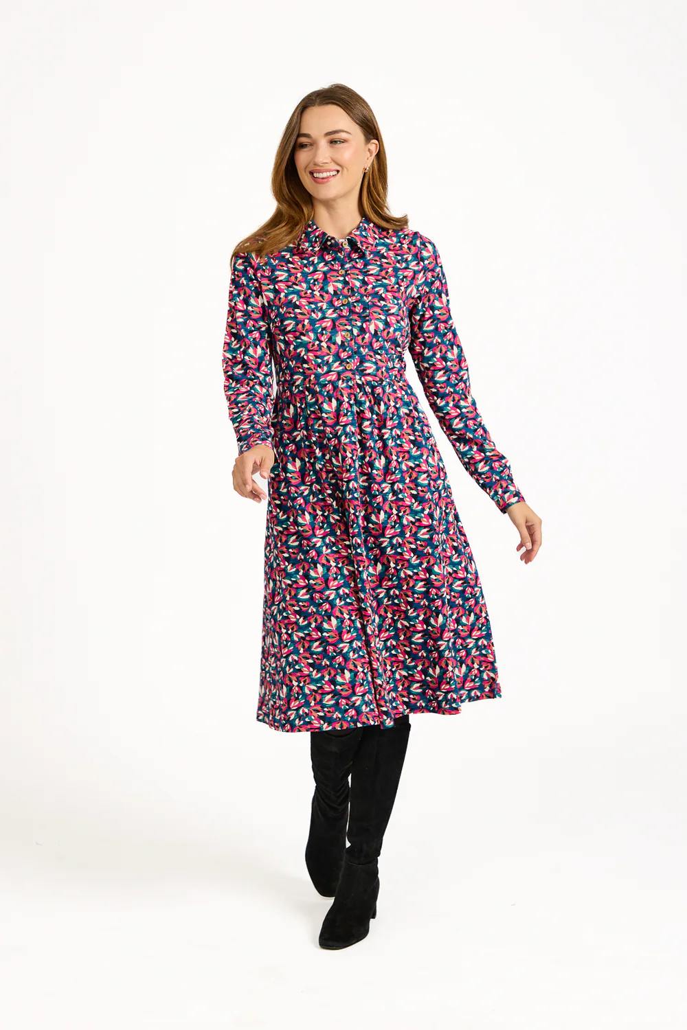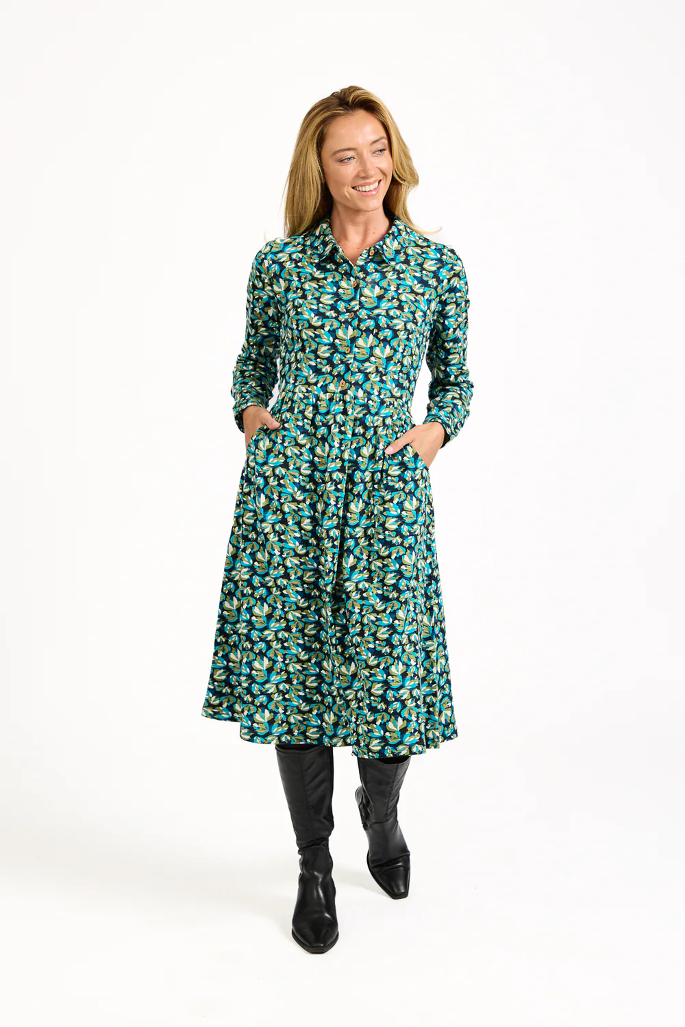 The Mudflower Abstract Leaf Button-Up Dress features a flattering fitted bodice, gathered skirt, and wood-finish buttons on the front and cuffs. With handy front pockets and a feminine midi silhouette, it’s both stylish and practical for everyday wear.