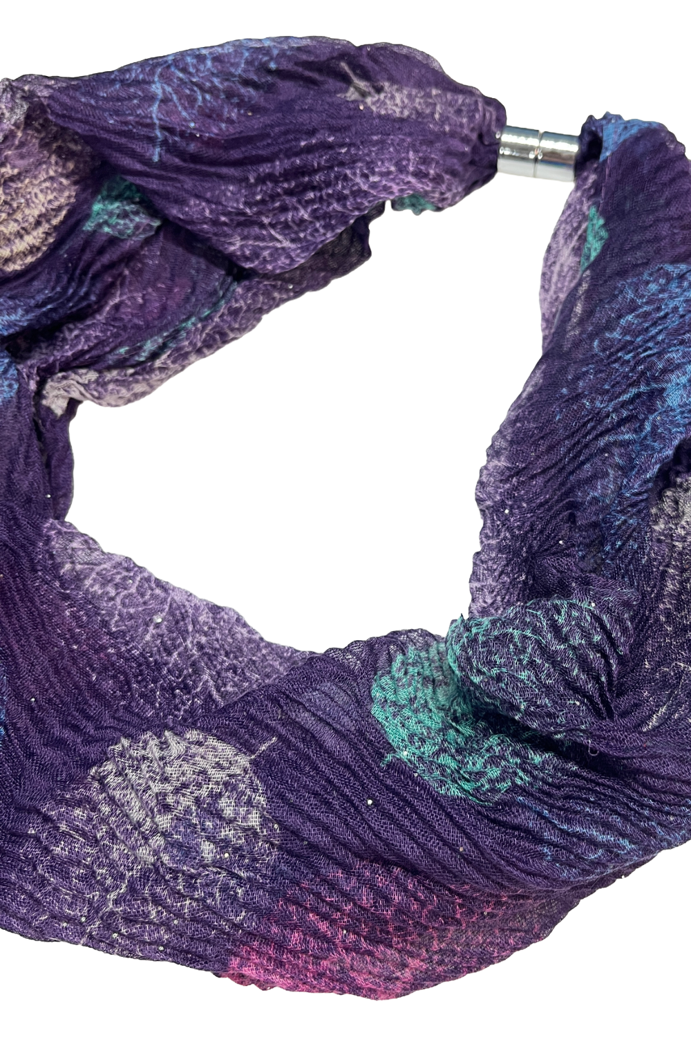 The Autumn Leaf Print Magnetic Scarf features large autumnal leaf pattern, soft pleated fabric with subtle glitter shimmer, and a convenient magnetic clasp. Available in warm shades for a charming seasonal accessory.