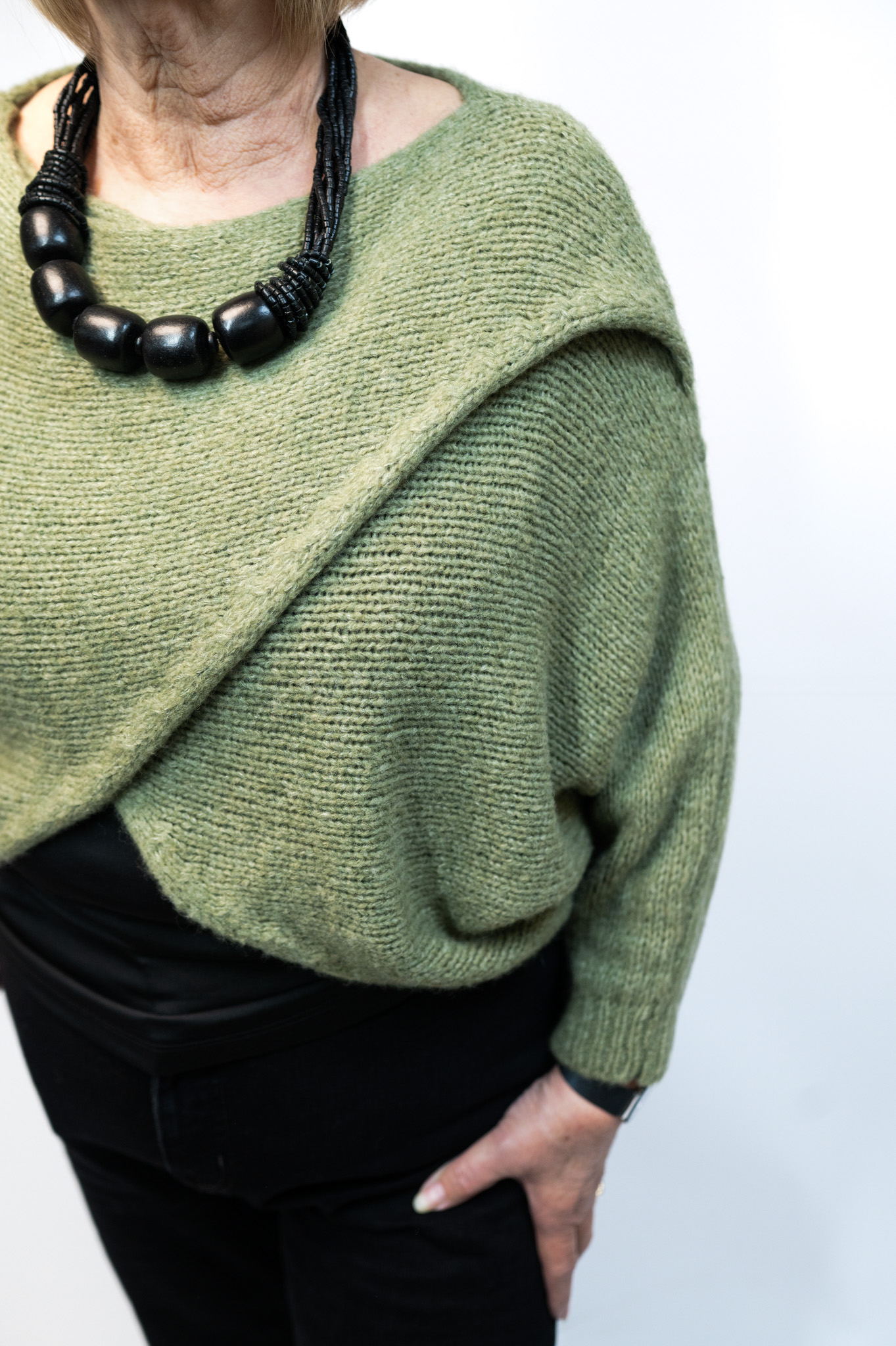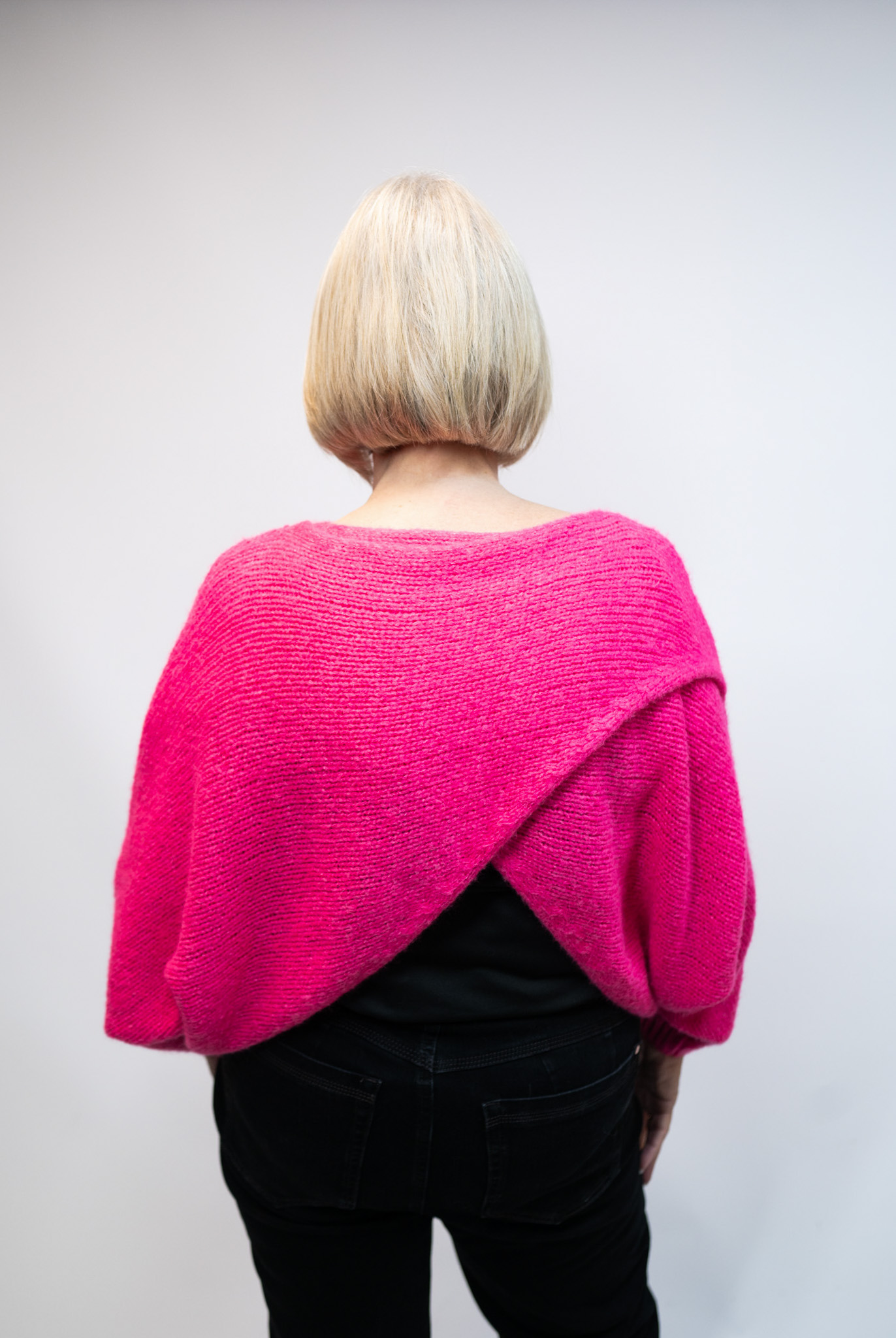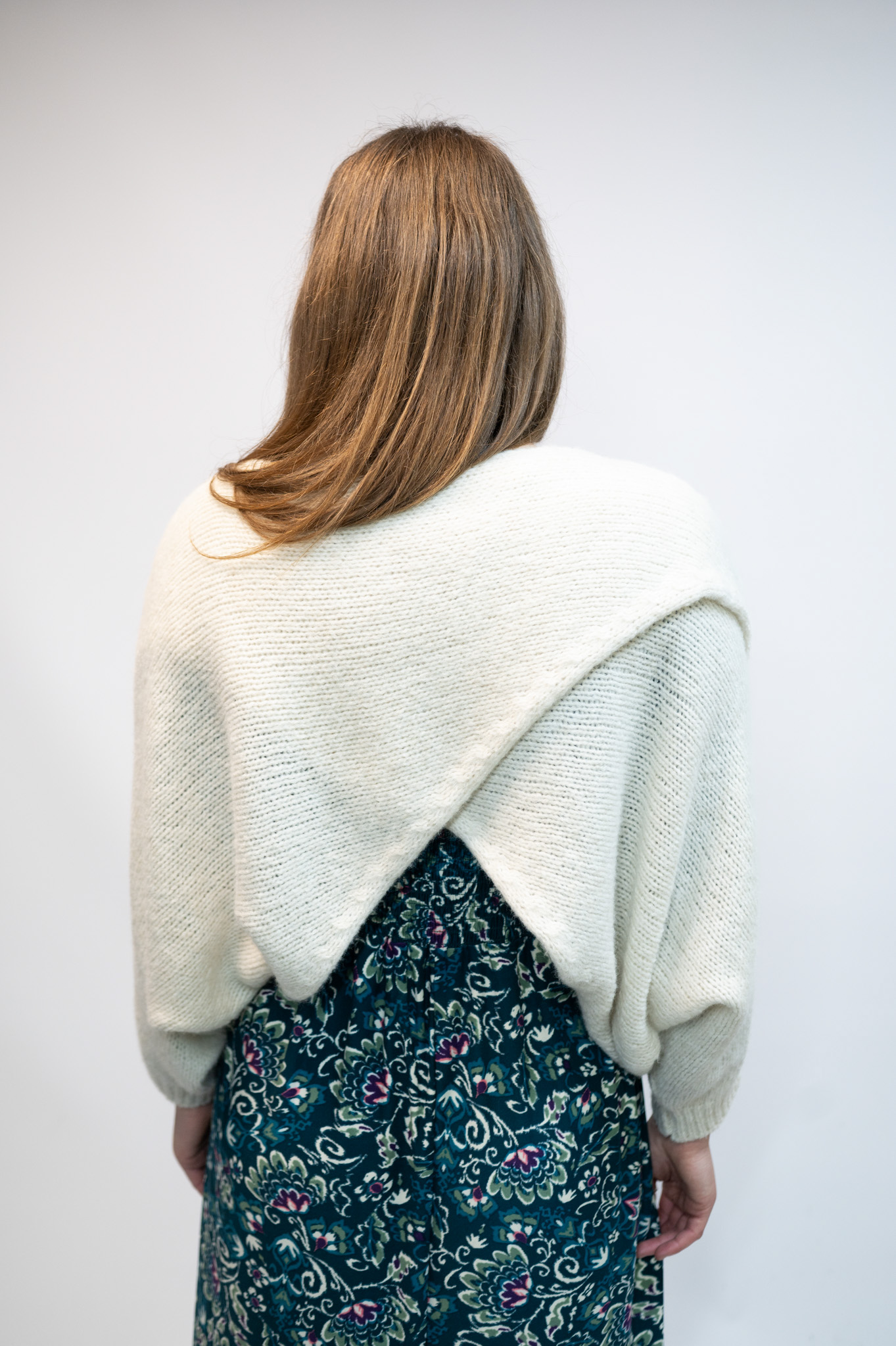 The Camilla Crossover Jumper is a versatile wrap-style knit designed to be worn with the crossover at the front or the back. Featuring relaxed batwing sleeves, it works beautifully layered over dresses or styled with jeans. Available in multiple colours.