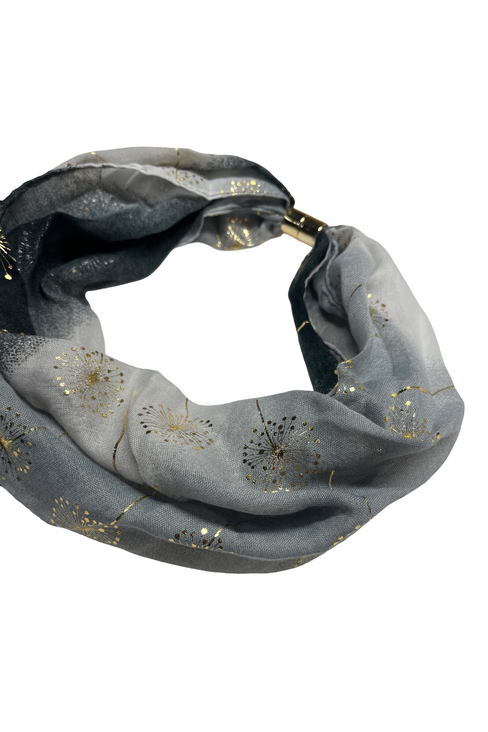 The Dandelion Magnetic Scarf features shimmering dandelion motifs over a soft silver and grey abstract gradient. Lightweight and elegant, it drapes beautifully and includes a practical magnetic clasp, offering an easy, refined accessory for day or evening wear.