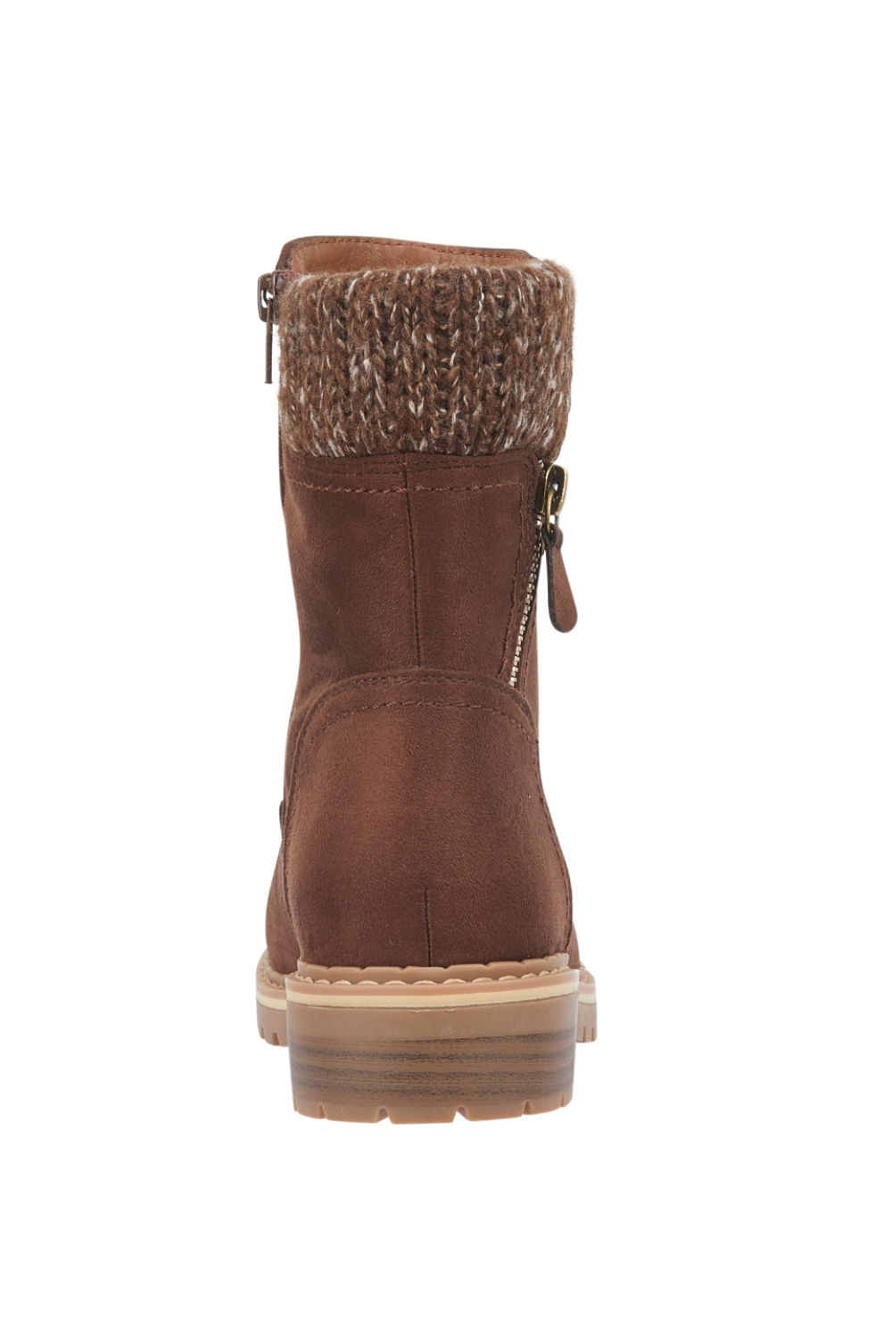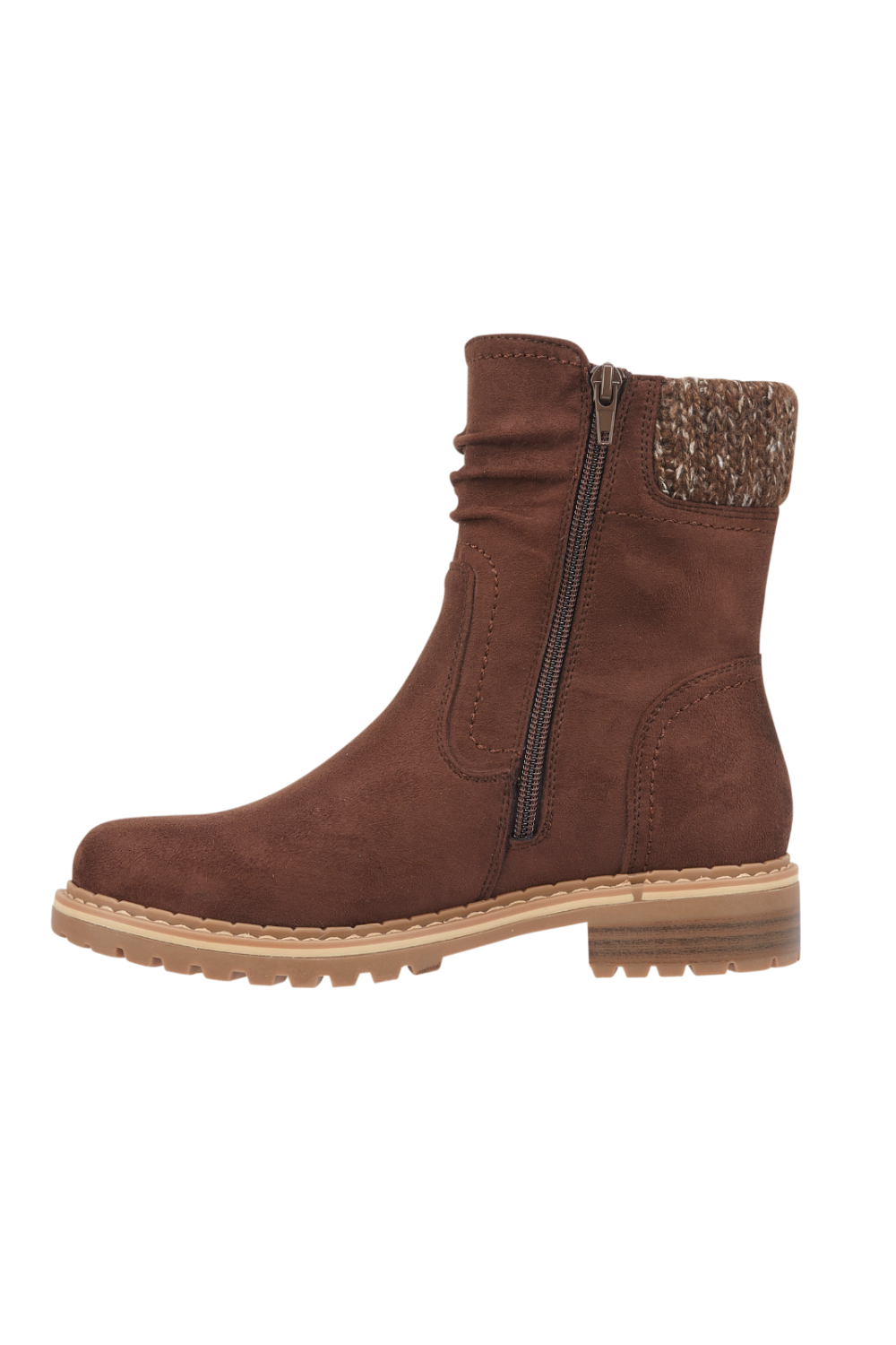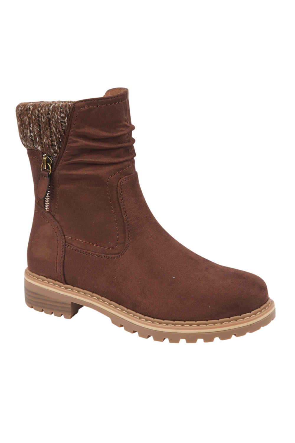 These Faux Suede Ankle Boots feature a soft upper cuff, convenient side zip, and chunky heel. Designed in tan and brown, they offer versatile style with a high-ankle fit for everyday wear.