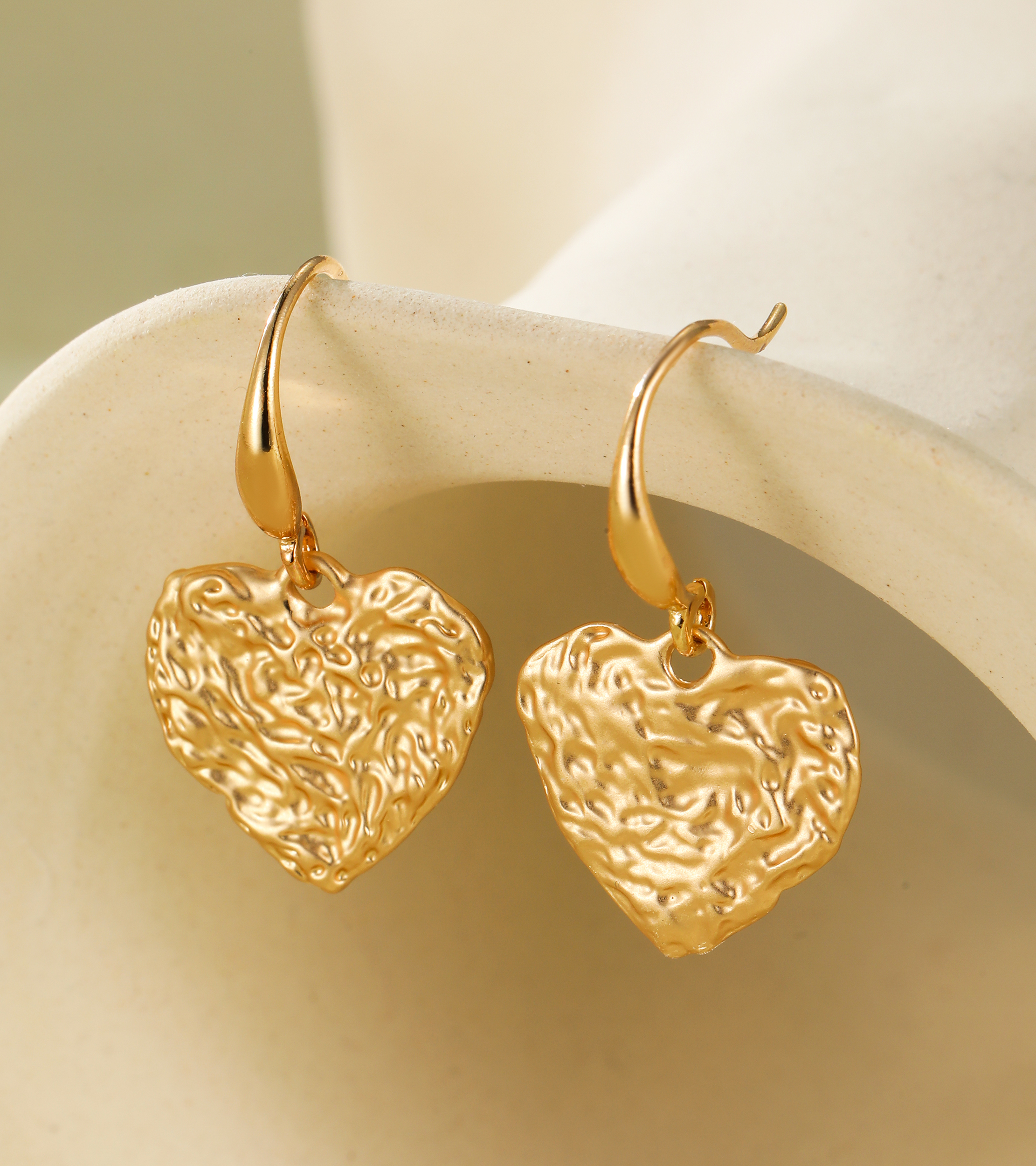 The Hammered Heart Drop Earrings feature a single hammered heart plate suspended from a drop setting. Available in silver or gold, these lightweight earrings add texture and subtle shimmer, making them suitable for both casual and evening wear.