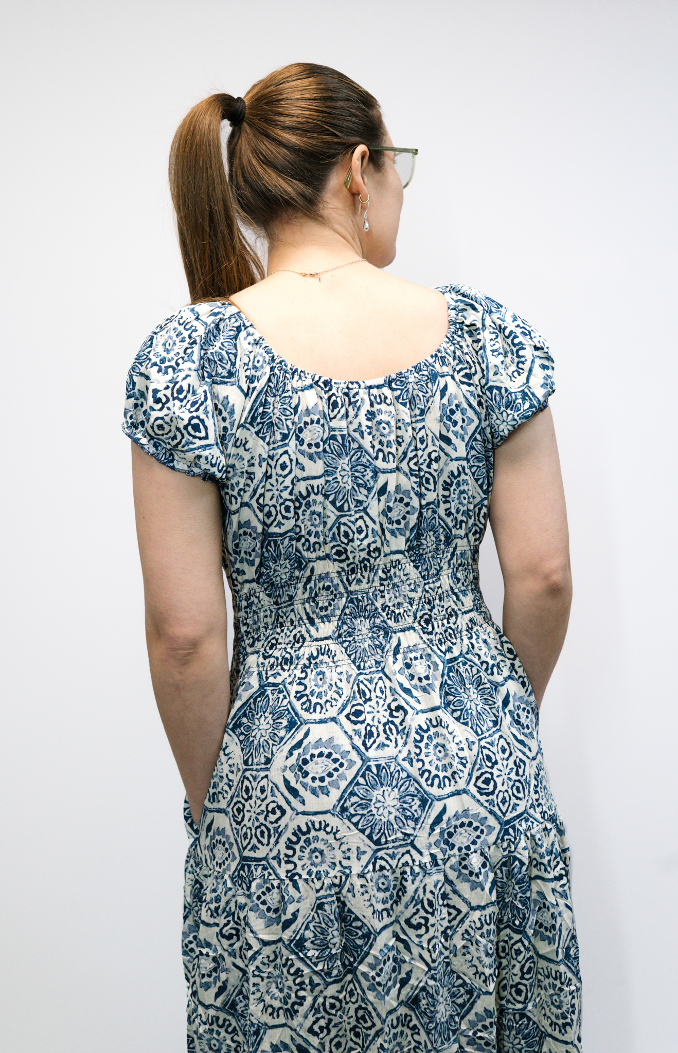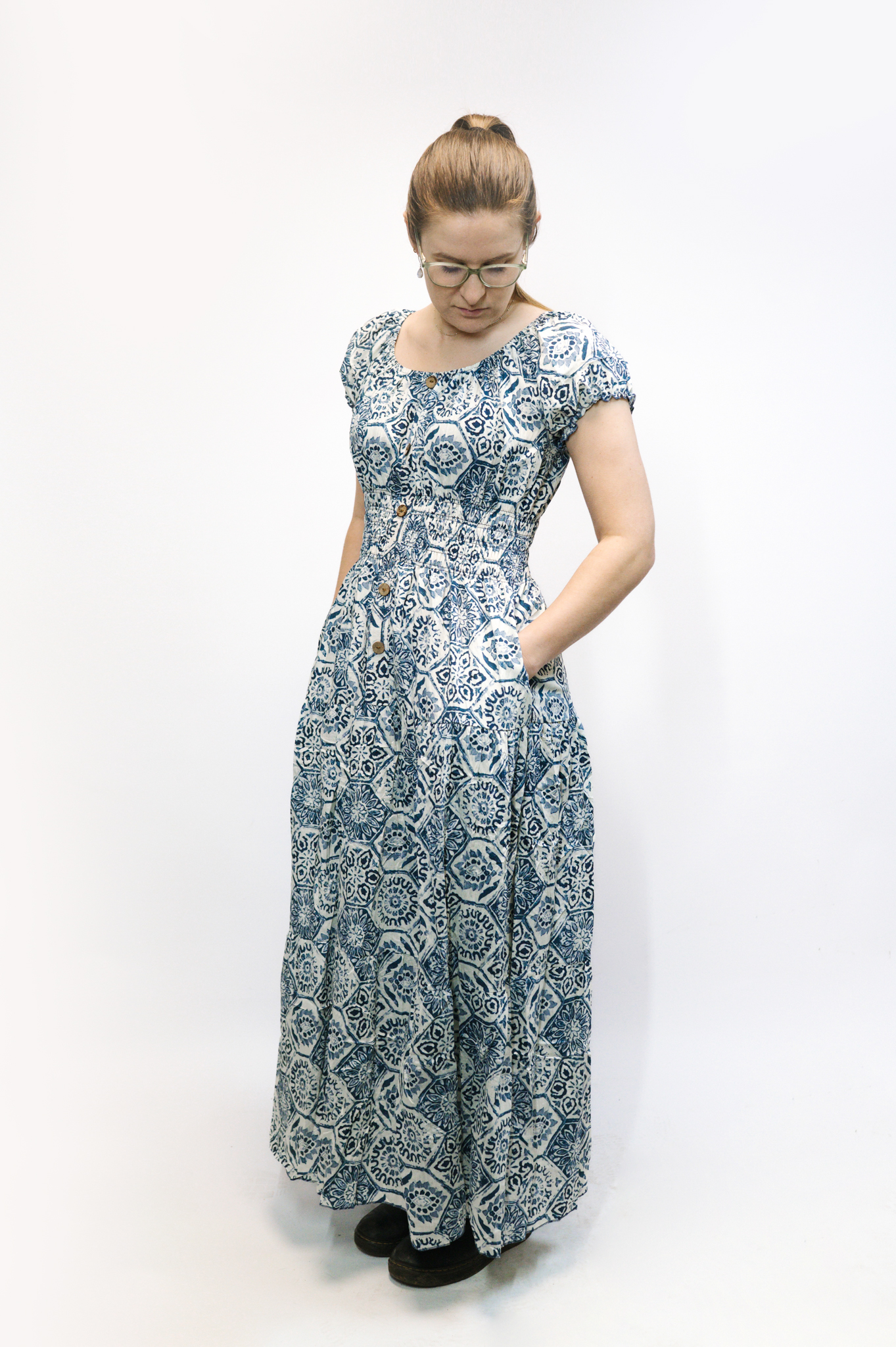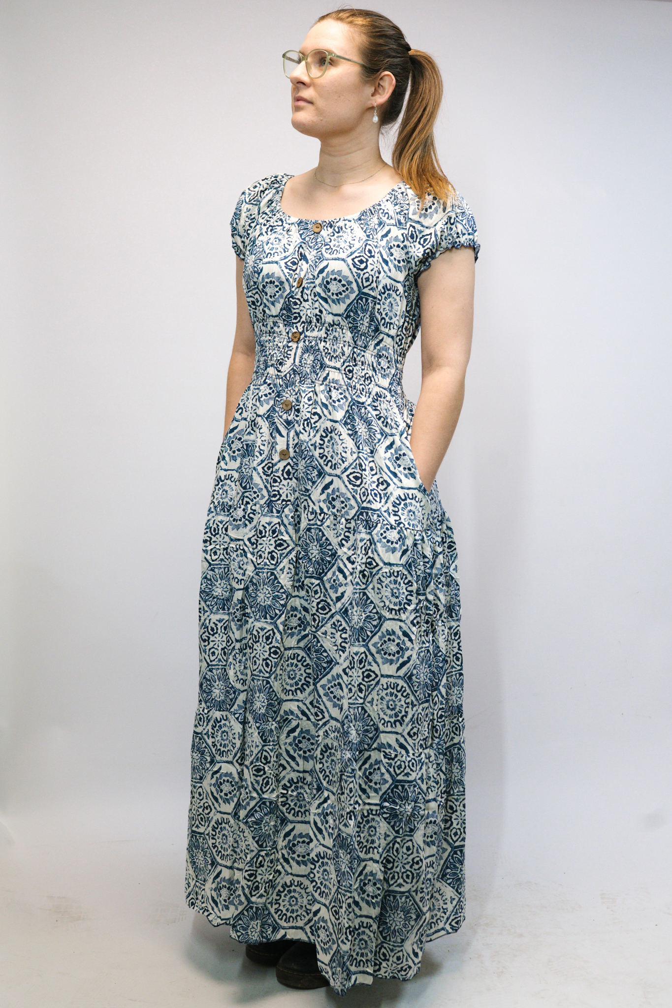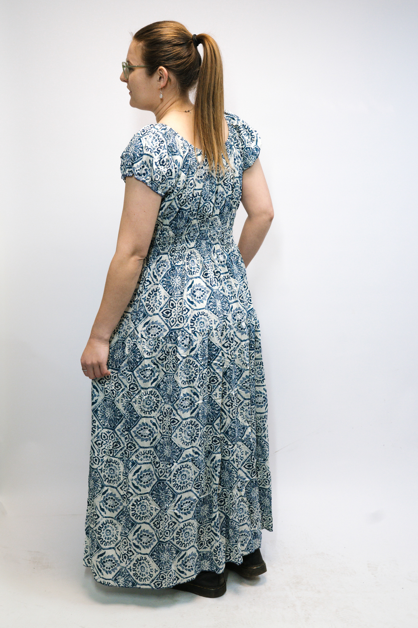 The Hexagon Blue Moroccan Print Maxi Dress, also known as the Tilley Dress, features a curved elasticated neckline, puffed sleeves, a faux button front, and an elasticated waist for a flattering fit across sizes. Model wears UK 10/12.