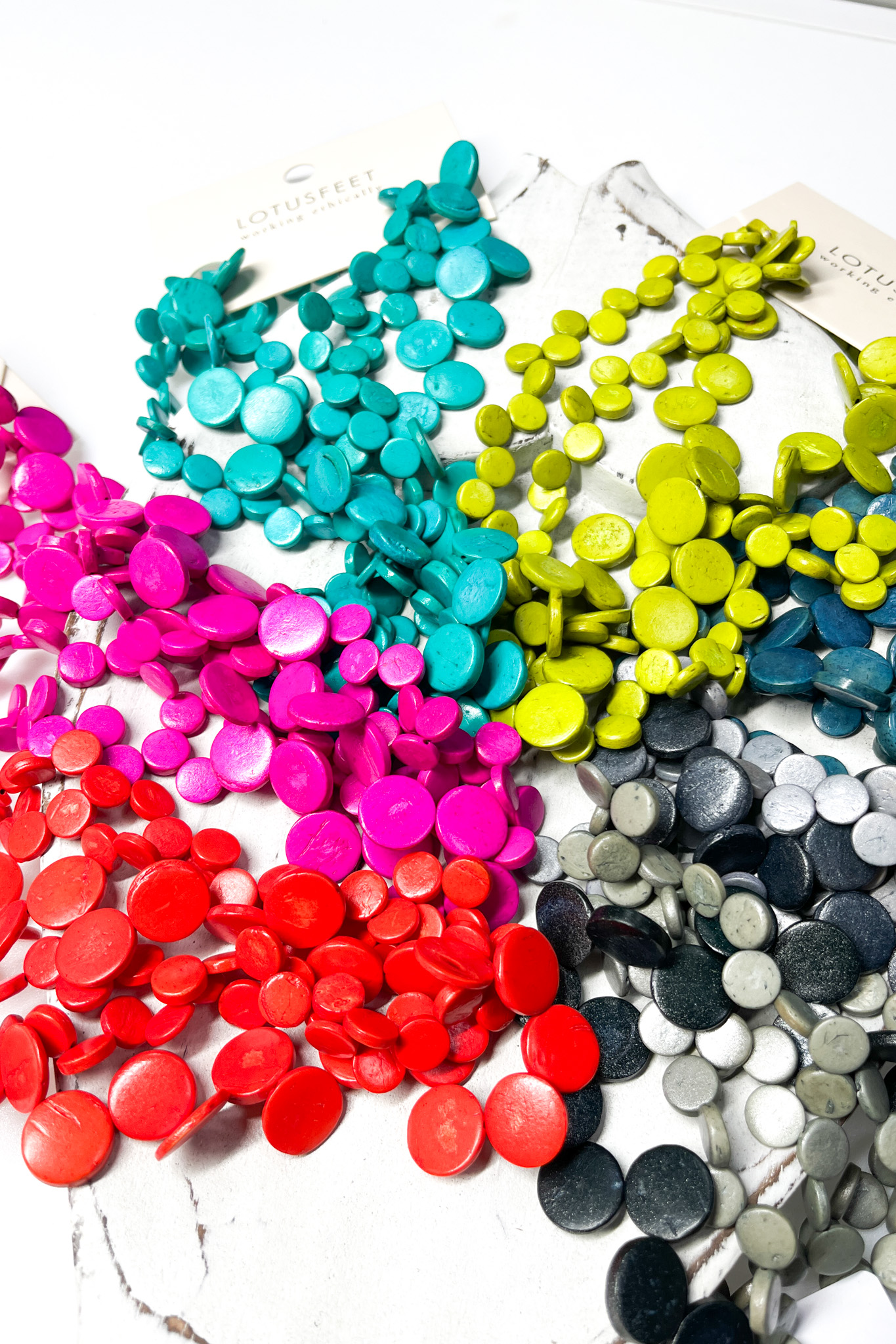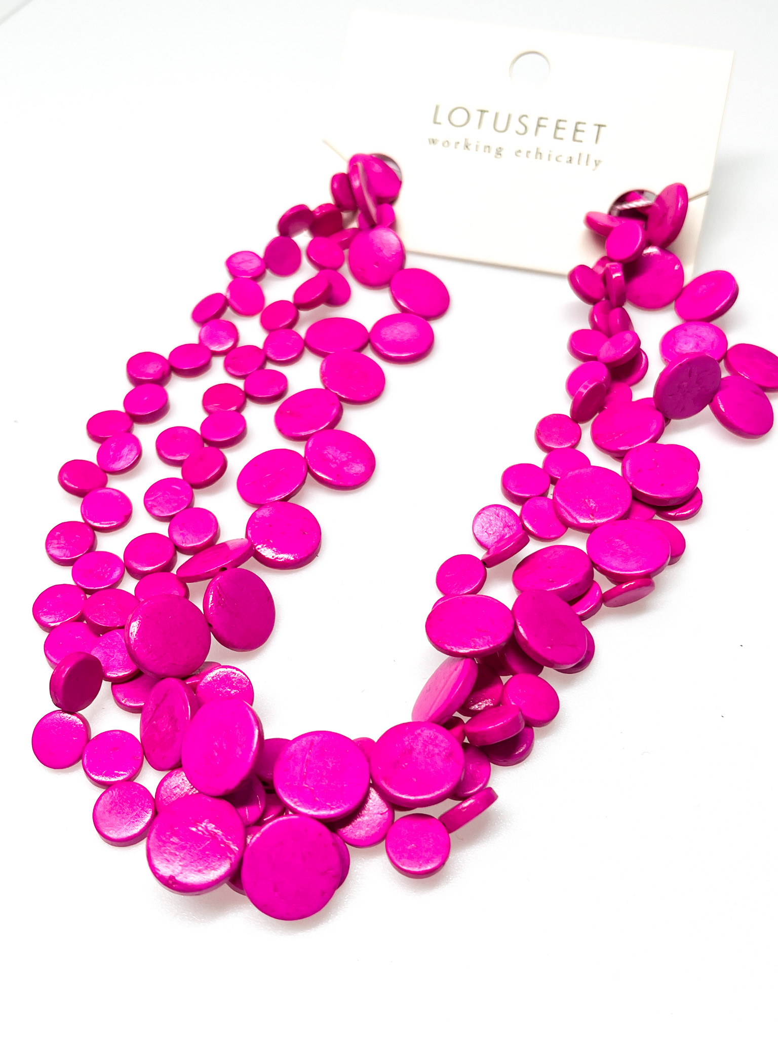 The Lotus Feet Multi-strand Wooden Disk Necklace features vibrant wooden disks across three strands, joined by a single clasp. Its bold, chunky layered look adds colour and personality to any outfit.