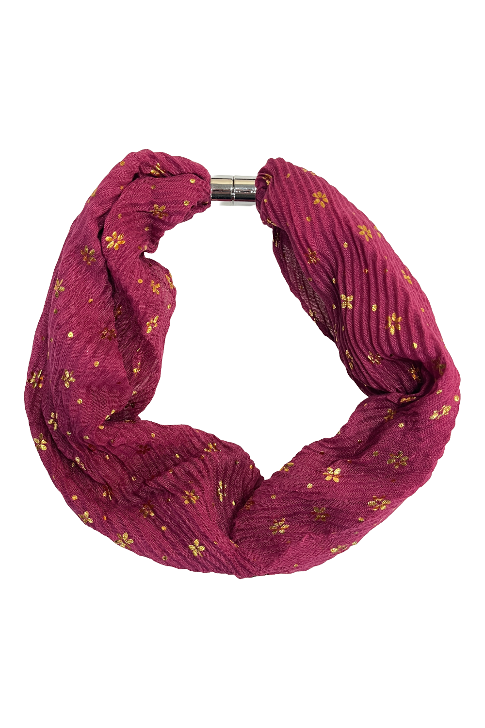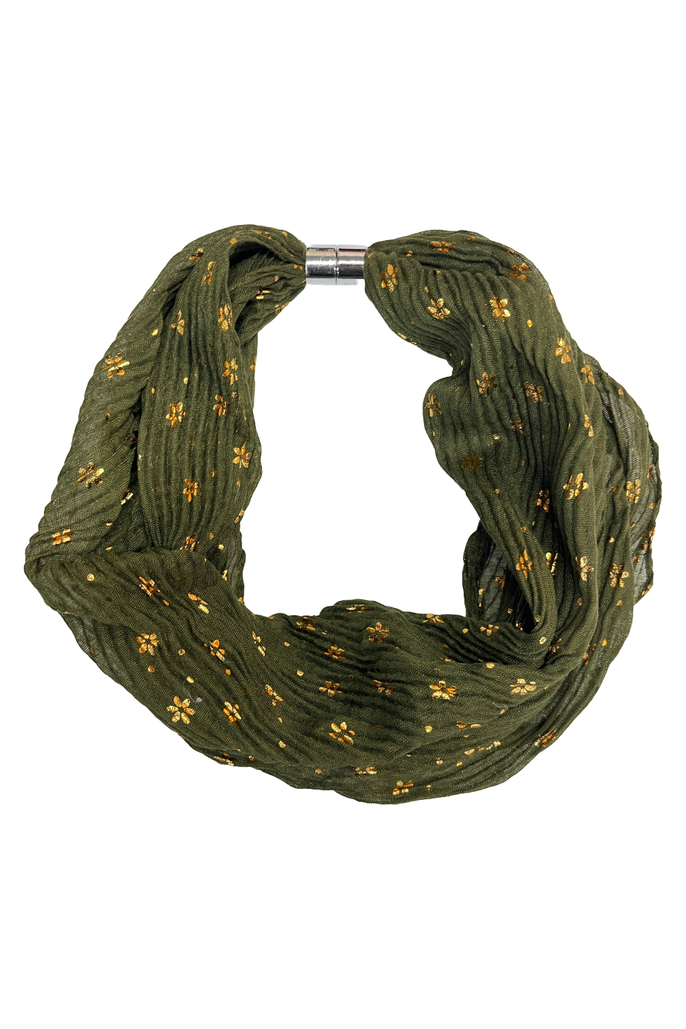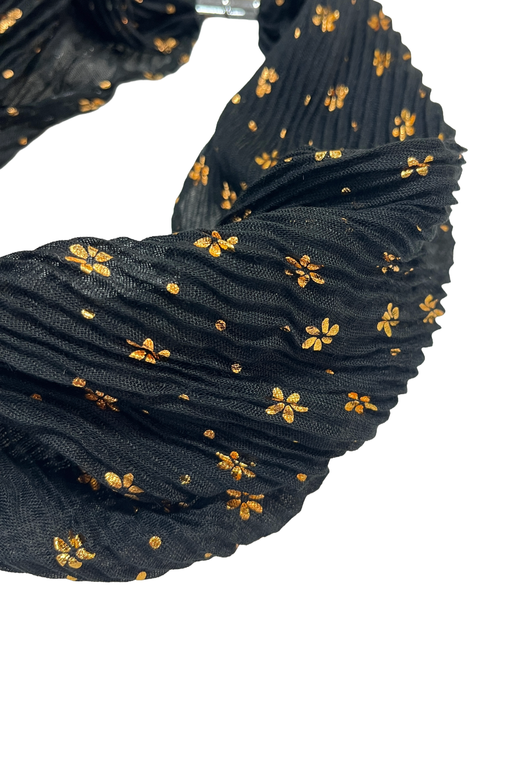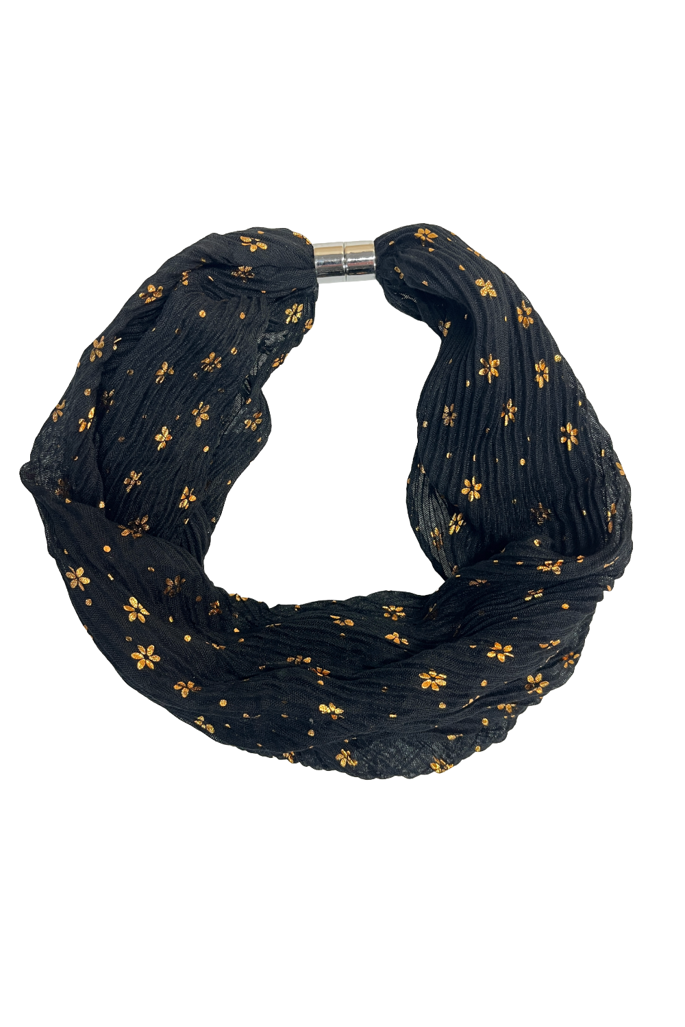 The Metallic Small Daisy Print Magnetic Scarf is crafted from soft pleated fabric with a shimmering gold daisy pattern. Finished with a secure magnetic clasp, this lightweight scarf adds subtle sparkle and floral detail to autumn-winter outfits.
