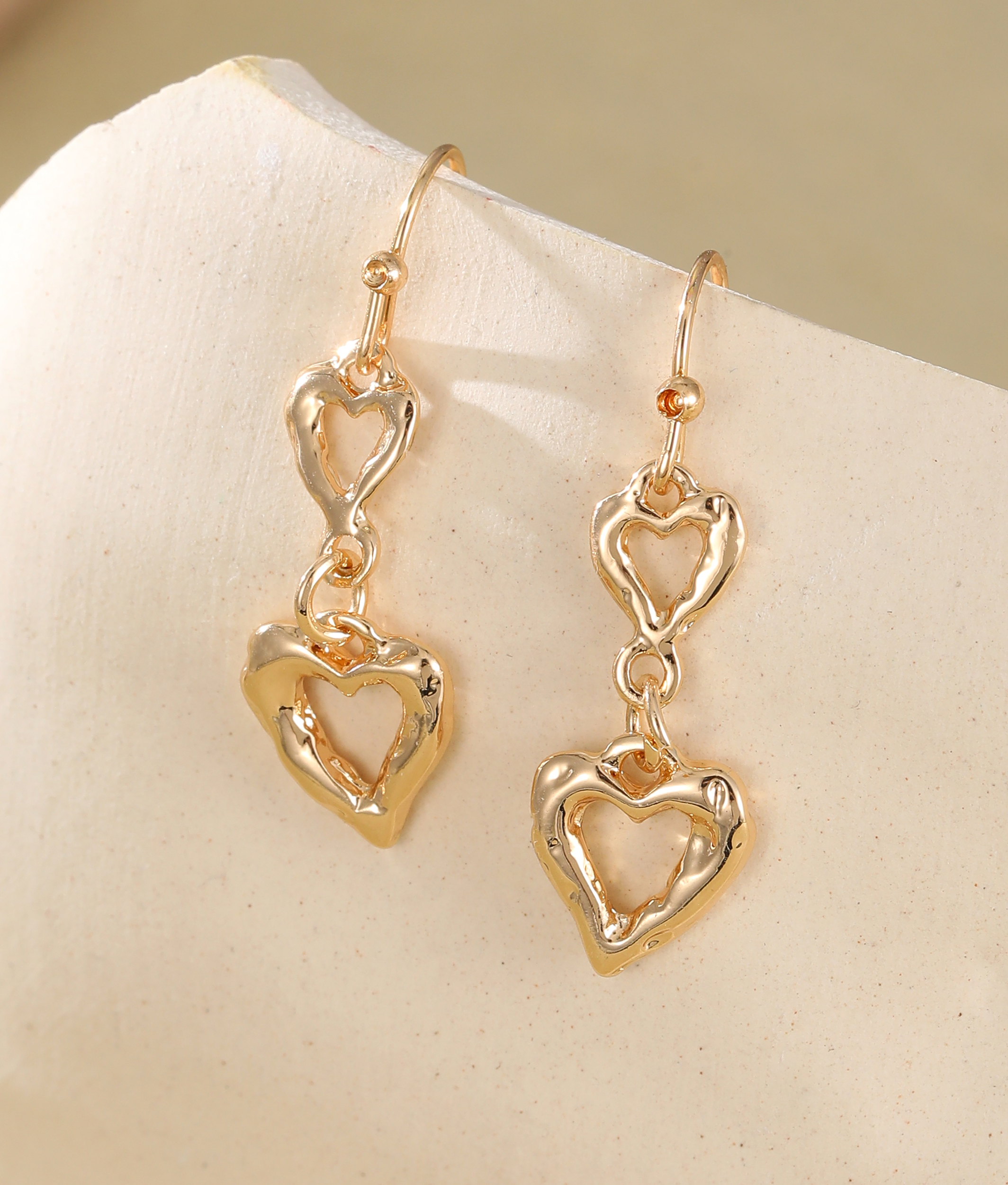 The Multi Heart Drop Earrings feature two stacked hammered-effect hearts that create a rustic yet elegant look. Available in silver or gold tones, these lightweight earrings add warmth and texture, perfect for everyday wear or romantic occasions.