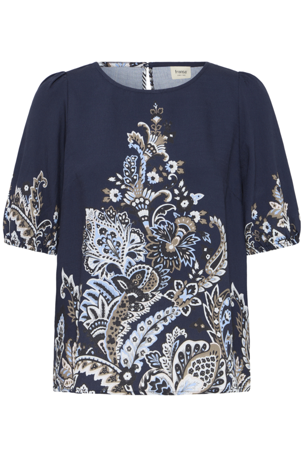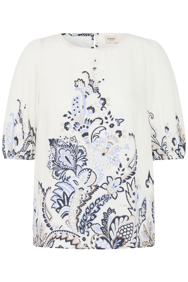 The Fransa Paisley Cream Blouse is a lightweight, airy top featuring puffed half sleeves and a delicate paisley pattern across the bottom half. Its relaxed fit and subtle detailing make it perfect for casual days or dressing up with tailored pieces.
