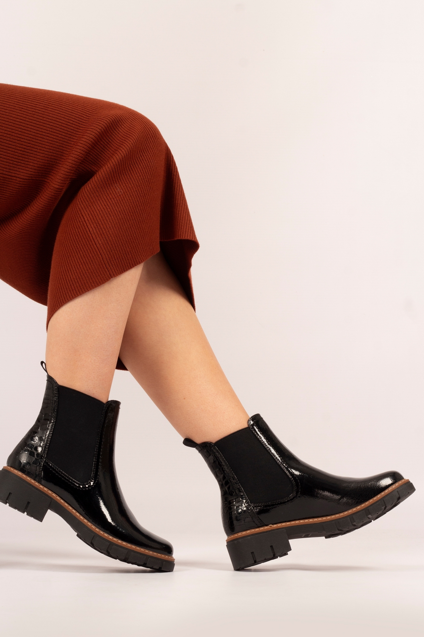 The perfect mix of comfort and style, the Lunar Shoes Peace ankle boot is a seasonal must-have. The croc print panel adds texture, while the chunky sole ensures a confident stride. A pull-on fastening makes it easy to slip-on and off.- Materials: upper made from PU