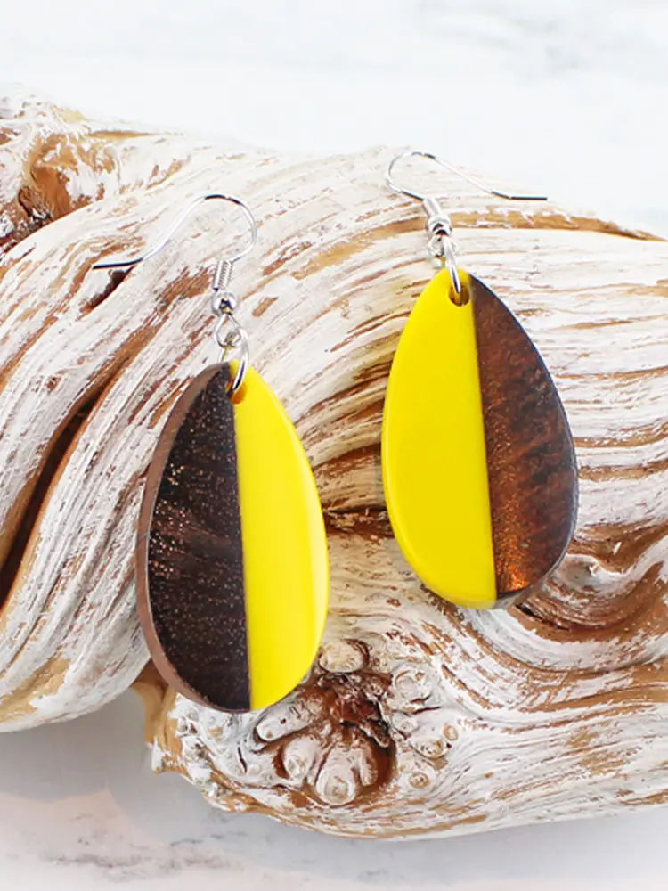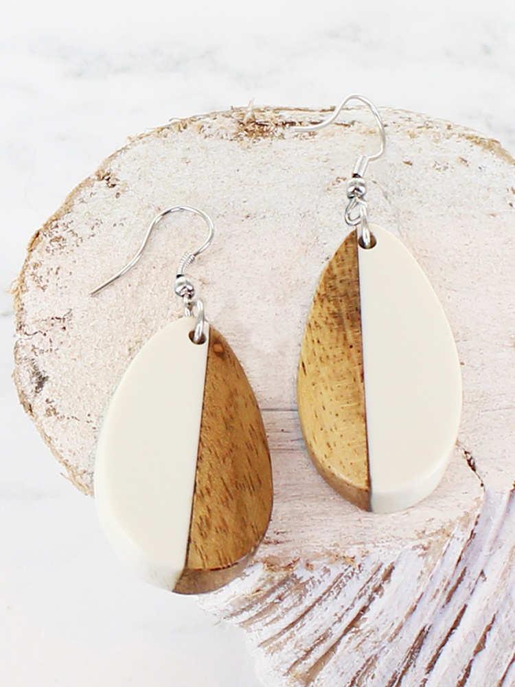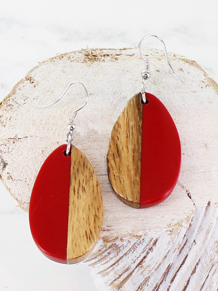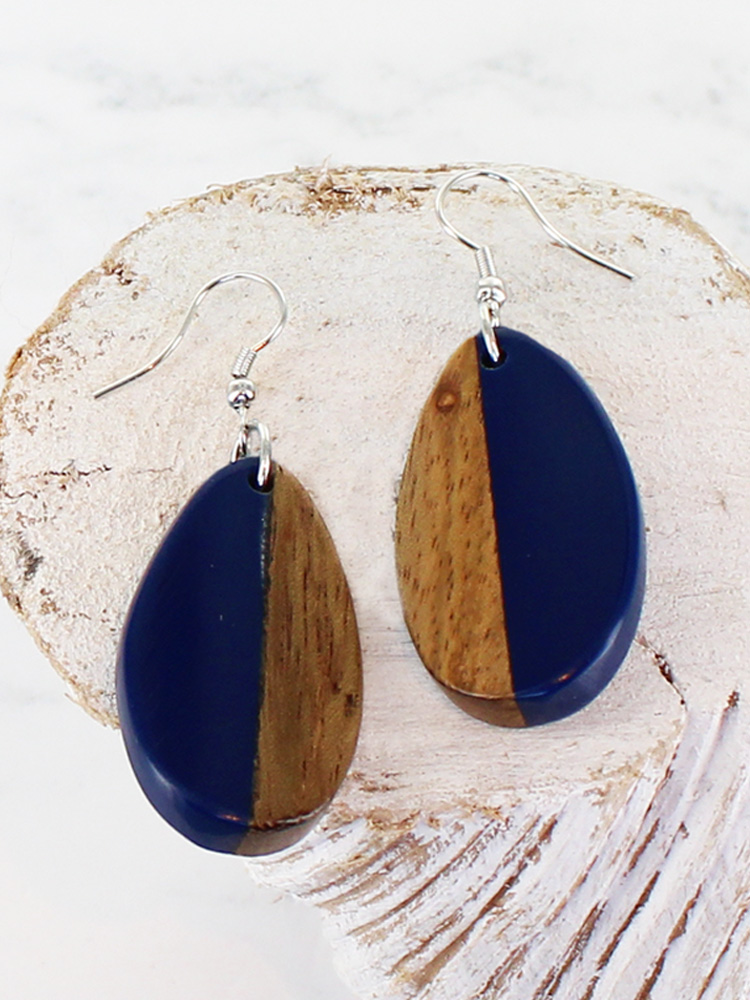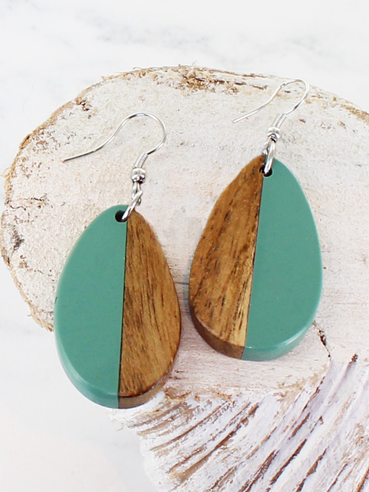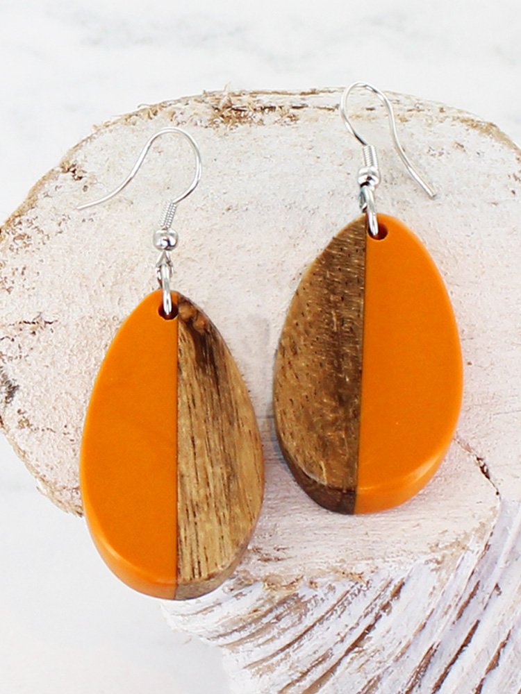 The Resin and Wood Oval Drop Earrings feature a distinctive half-and-half design, combining coloured resin with natural wood in an oval shape. Set on a simple drop fitting, these lightweight earrings offer a balanced contrast for everyday or occasion wear.