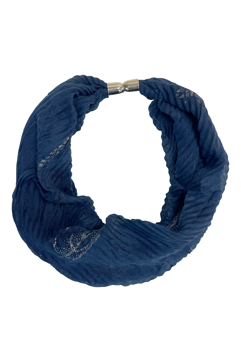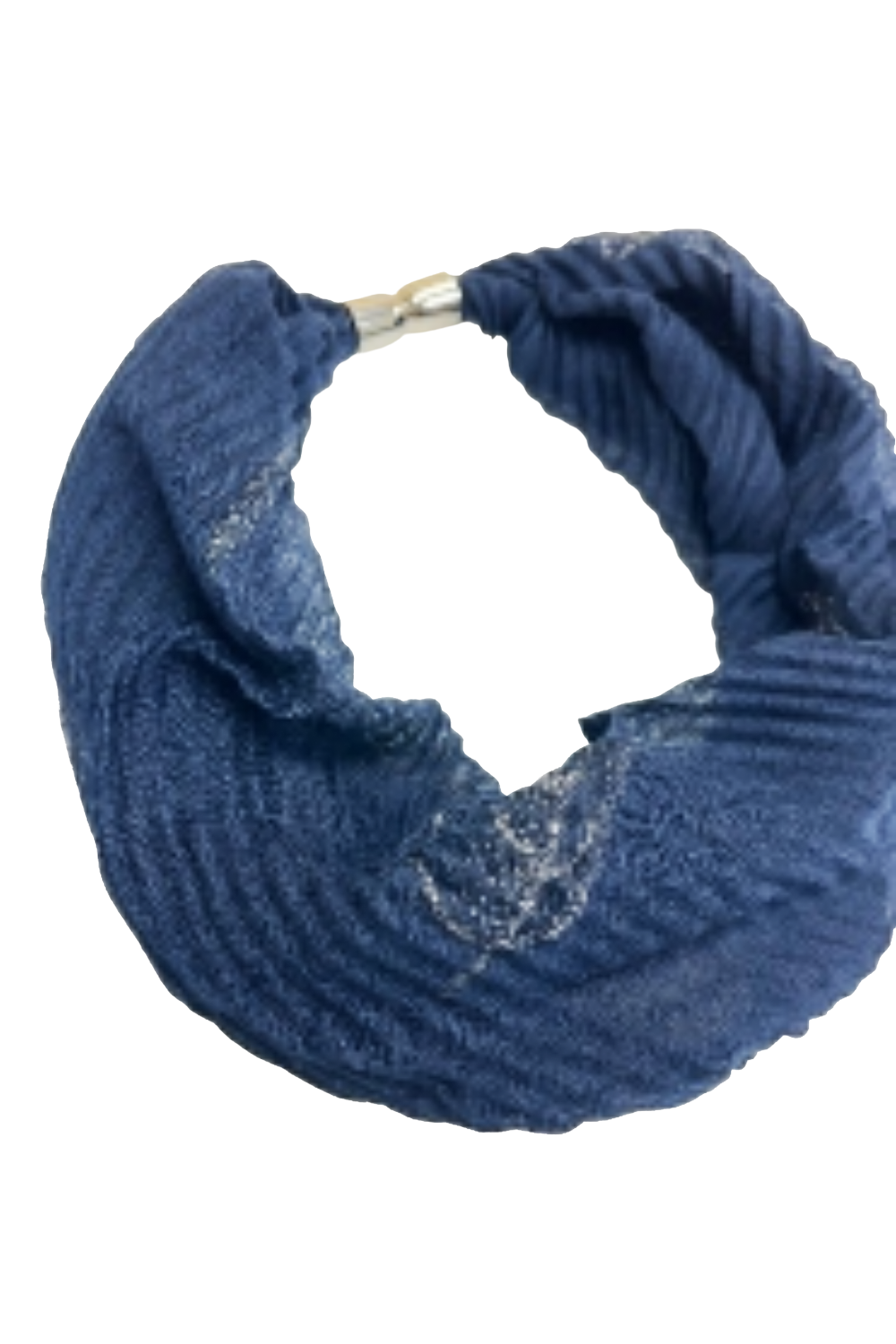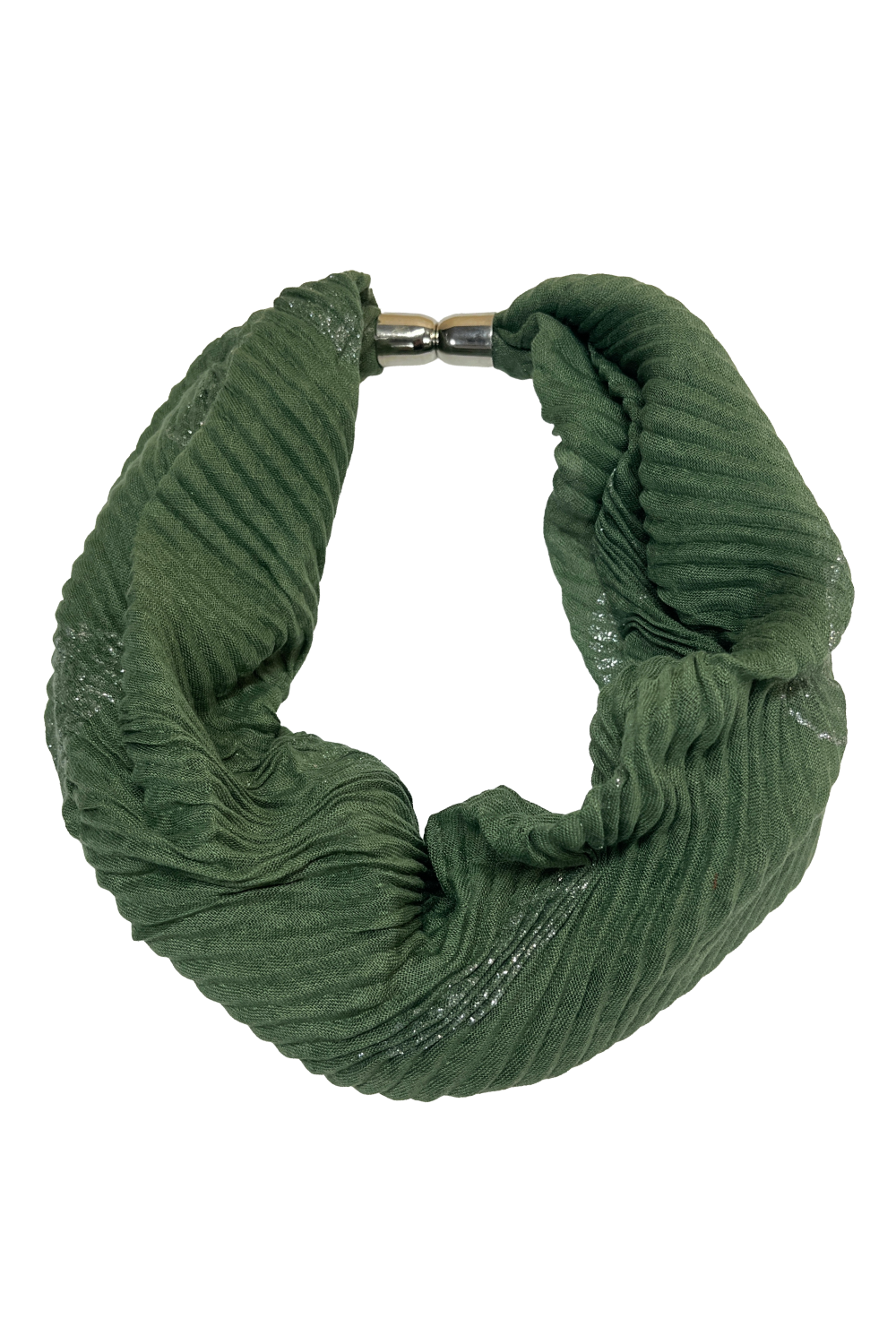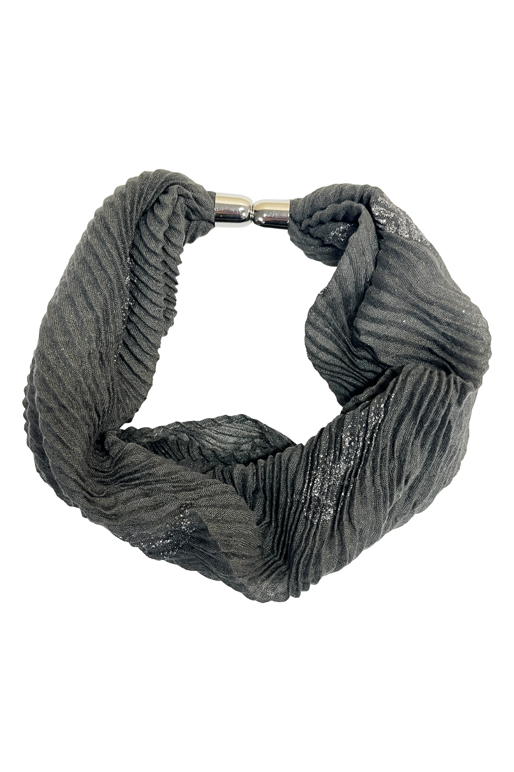 The Small Glitter Leaf Magnetic Scarf is made from soft pleated fabric, decorated with a subtle glitter leaf pattern. Complete with a handy magnetic clasp, this lightweight scarf is perfect for adding seasonal sparkle and warmth to autumn-winter looks.