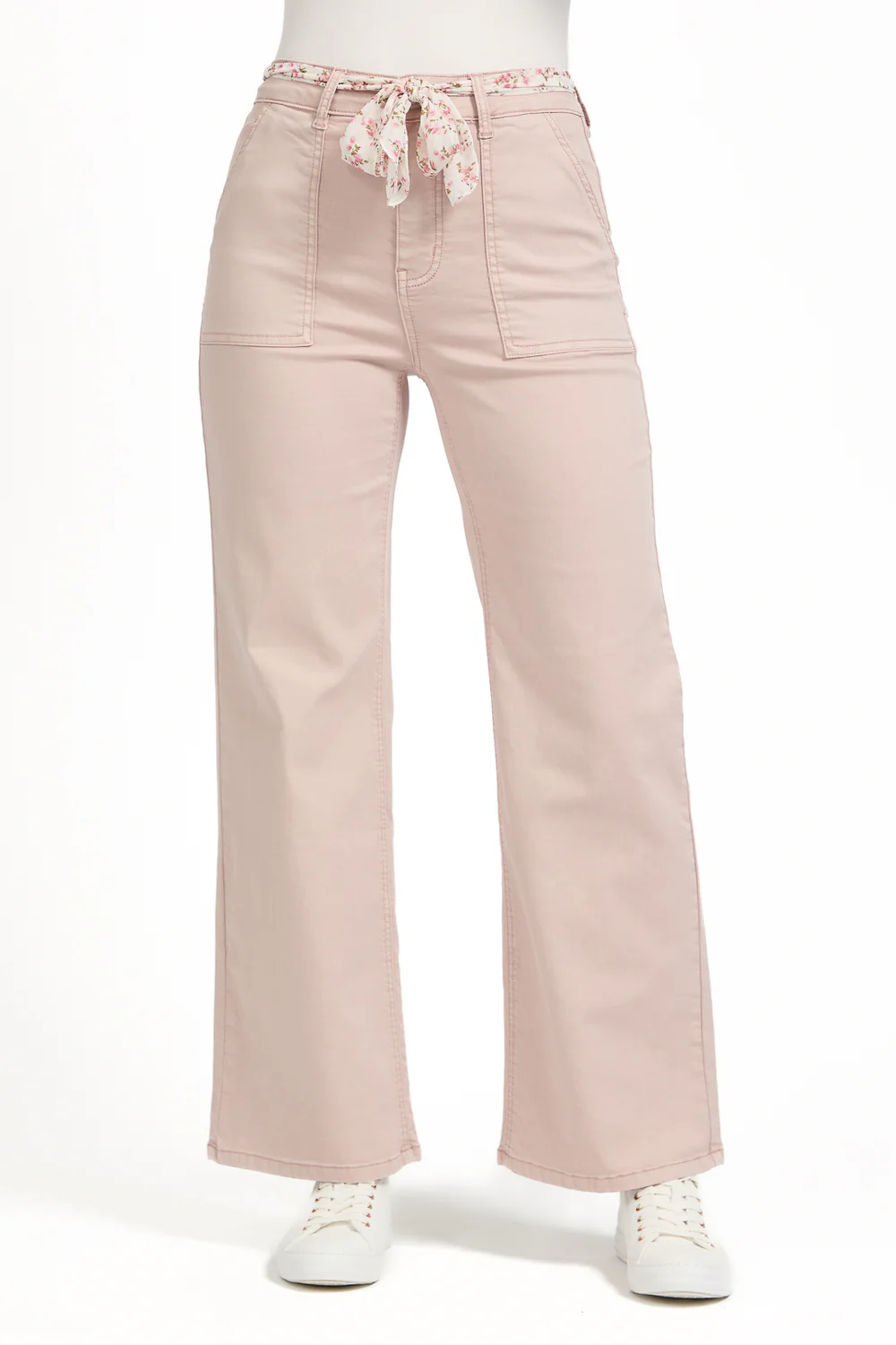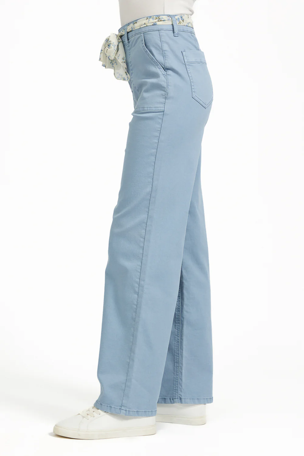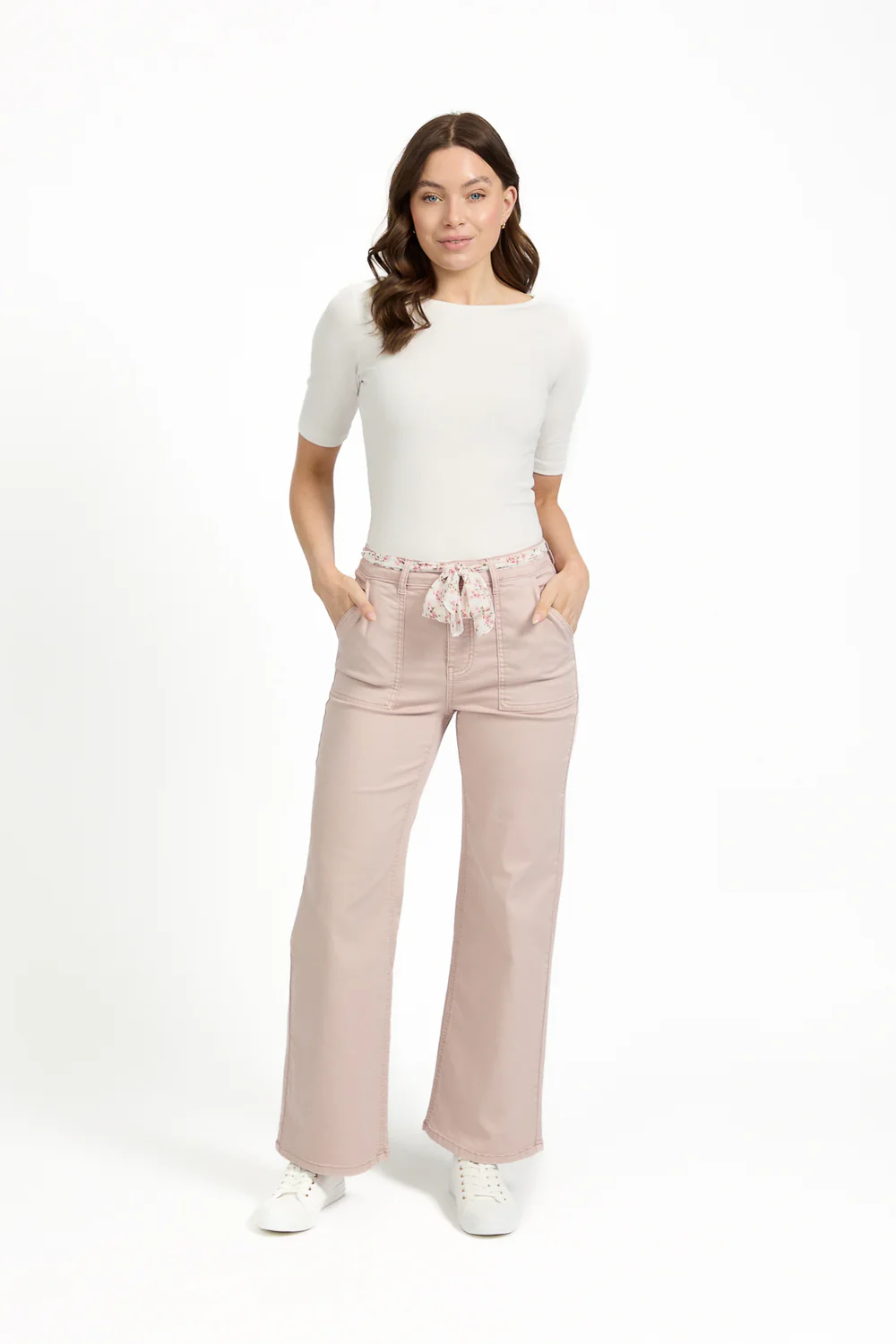 Mudflower Wide Leg Pastel Cargo Trousers feature a relaxed fit with a soft pastel finish. Designed with large front pockets and a detachable floral scarf belt, they offer a practical yet stylish look for casual days and easy everyday wear.